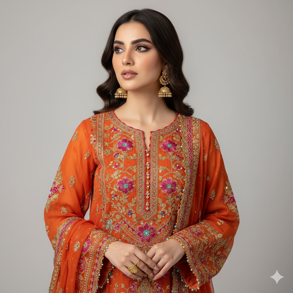 Brighten your wardrobe with this vibrant orange kurta set, featuring delicate embroidery and a comfortable, elegant fit perfect for daytime events.